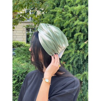 Turban en tissu fluide au vert sauge et blanc qui apportent douceur et luminosité.