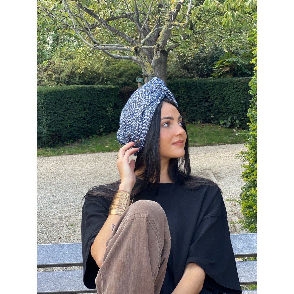 Turban en tissu noir profond avec de légers reflets scintillants, pour un look à la fois sobre et sophistiqué.