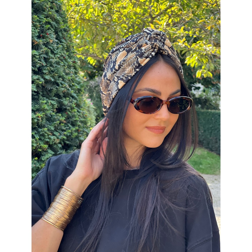 Turban en tissu fluide à imprimé python noir, beige et doré, pour un effet sauvage et ultra tendance. Il apporte caractère et élégance à vos looks, parfait pour celles qui aiment oser.