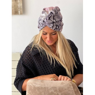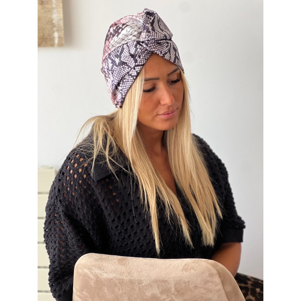 Turban en tissu fluide à imprimé serpent dans des tons gris, blanc et rose poudré.