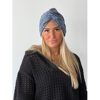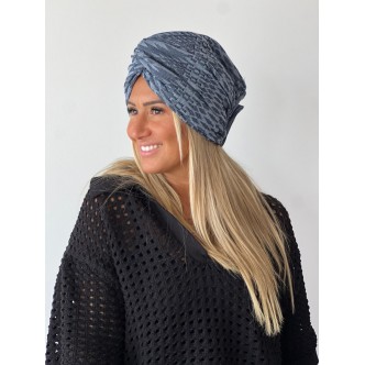 Turban en tissu extensible bleu-gris à motifs géométriques ton sur ton.