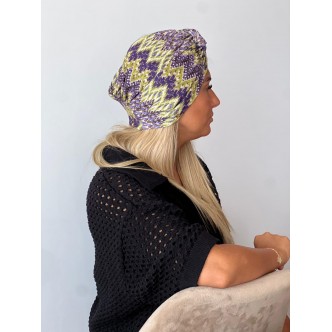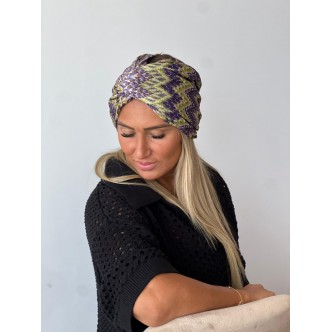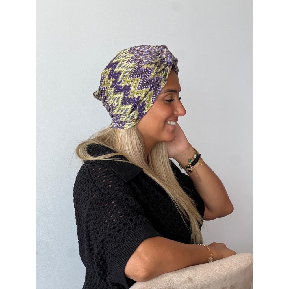 Turban aux nuances de violet et vert avec des motifs ethniques vibrants. Confortable et extensible, parfait pour dynamiser une tenue. Apporte une touche d’originalité et de caractère.