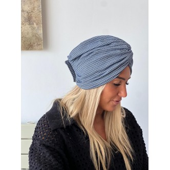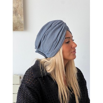 Turban en jersey extensible bleu décoré de petits pois noirs. Sa matière légère et respirante assure un confort optimal. Un modèle original et discret, parfait pour un look moderne.